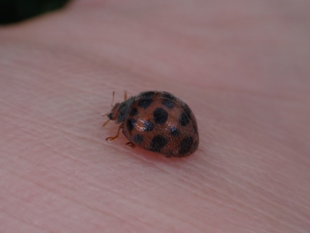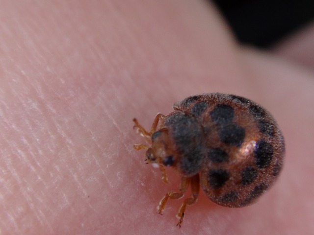 ナスの葉の上にカワイイ半球型の虫。園児に人気のテントウムシに似ていますが背中のテンテンが多いのです。ガーデナーを悩ますテントウムシダマシです。ドリカムタイムで植えたナス、ピーマン、ミニトマト全部お好きとのこと。今朝の発見は1匹でしたが葉裏にたくさん隠れていることでしょう。毎朝見回って逮捕します。まずはどんな顔つきか手のひらの上で接写しているとコロコロ転がって脱走しました。追跡不能。マ いいか。 クヌギの芽のカメムシさんも触ると臭いので、マ イイカ。