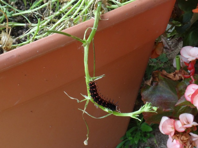 玄関前のパンジーのプランターはほぼ食べつくされました。仕方なくバックヤードに移動していると、すでにサナギとなりパンジーの茎にぶら下がってる個体がいました。あのとげとげの幼虫から想像できない美しさ。数日後、チョウの姿になると思うと不思議です。 ホームページに載っていた兵庫県明石市立魚住東中学校 竹内 良範 先生の論文によると「蛹の期間は雌雄に関係なく7日間である。産卵日から28日後に成虫が誕生したことになる。」とあります。一週間飲まず食わずで大変身。エライ!。幼虫の時だって食べるのはパンジーの葉っぱだけ。パンジーの葉っぱにはあの金ピカ模様のもとになる成分があるのだろうか? 疑問は増すばかりです。