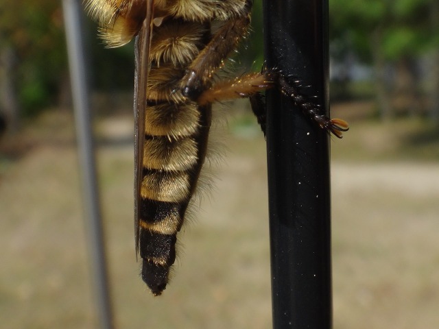 アサガオの葉を食われたり、ナスの葉の汁を吸われたり、ガーデニングをしていると知らない虫に邪魔されているように思いますが、この虫は味方かもしれません。たぶんムシヒキアブ。ハエやテントウムシダマシやコガネムシを食べてくれるはず。そう思ってみると姿かたちが頼もしく見えます。
