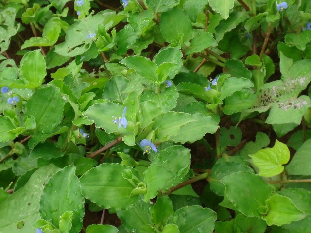 サツマイモ畑のツユクサは少し趣が違います。マルバツユクサかもしれません。栽培品種でも野草でも青い花の植物は比較的少なく感じます。電動草刈り機の手が止まります。芋の成長の邪魔はしそうにないから結構大きな群落ですが咲かせておきます。