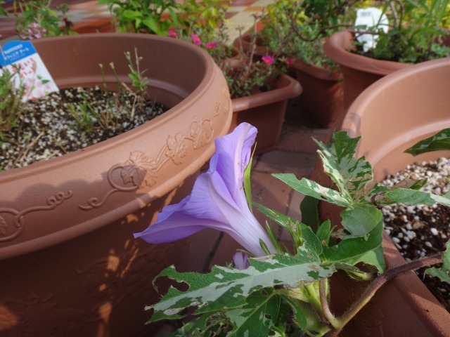 今年はショウリョウバッタが大発生で、アサガオの葉も花弁も食べられています。それでもけなげに毎朝涼しさを届けてくれます。