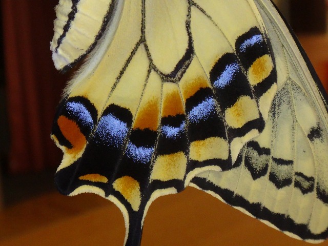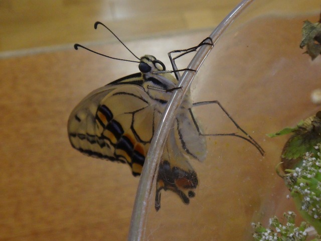 園長の独り言の9月12日は「先生のお部屋のペットになったアゲハ蝶の幼虫」、9月19日には「さなぎになったアゲハの幼虫」(さなぎになったのは9月15日)、さて本日9月25日の朝に羽化していました。じっとしているので接写で撮影できました。子どもたちも先生も大喜びです。