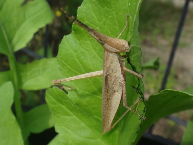 9月13日に子どもたちがドリカムタイムでダイコン、ホウレンソウ、ニンジンの種まきをしました。その大根の葉がバッタに食べられています。とてもうまそうに食べています。幼稚園の野菜の収穫は見つけた人の早いもの順なので、バッタはこのルールを知っているのかもしれない