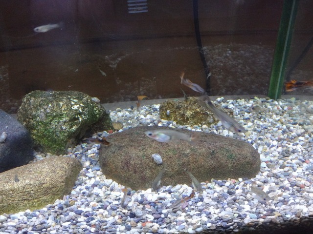 数年前に園児のおばあちゃんからいただいたグッピーが、6月ごろから個体数をどんどん増やしています。国内では沖縄県あたりの気候が好きなグッピーは夏が大好きなのですね。階段下のあまりエアコンの影響を受けない場所がかえって過ごしやすいのかもしれません。毎日が水遊びのグッピーたちをみて子どもたちは羨ましく思っていることでしょう。
