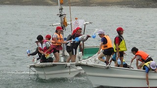 櫓こぎの練習後、福岡教育大学の学生さんを交えての水かけ大会。子どもたちも先生も、そして操船のPTA会長はじめ地島の皆さん全員がずぶぬれです。